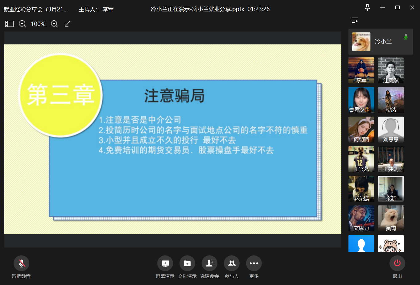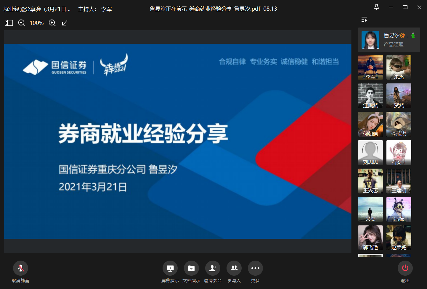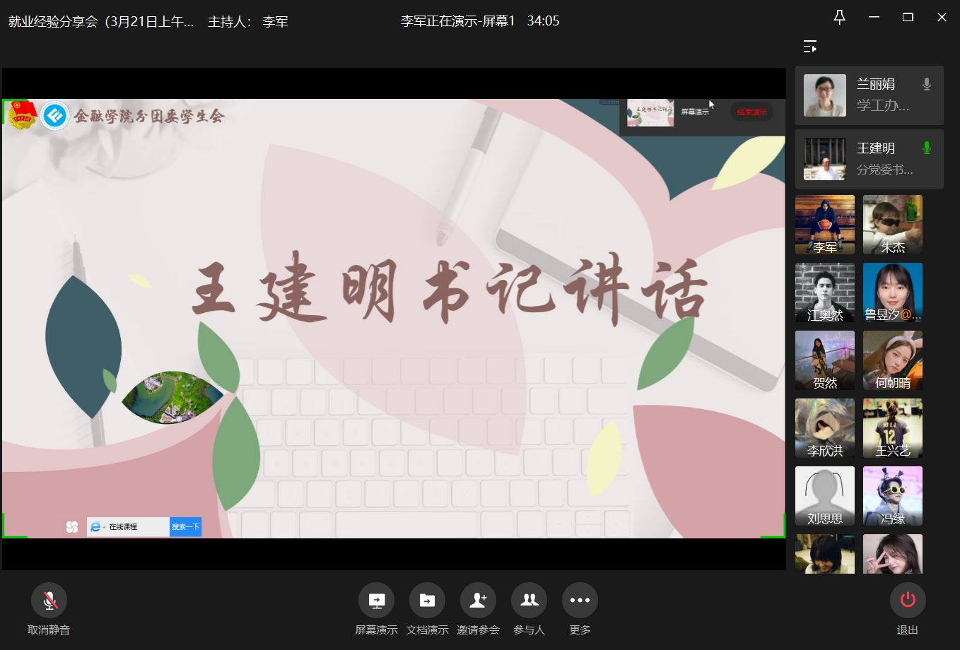 3月21日上午10:00,2138CC太阳集团就业经验分享会于企业微信成功举办。本次活动邀请到国信证券股份有限公司的12级CFA专业鲁昱汐、广发银行股份有限公司的16级金融五朱杰、德勤华庆商务服务有限公司的16级投资二冷小兰、中汇国际保险经纪公司的16级保险一文思力进行就业经验分享。2138CC太阳集团党委书记、副院长王建明,2138CC太阳集团党委副书记、纪委书记余新,以及2138CC太阳集团一百多名同学参加了会议。