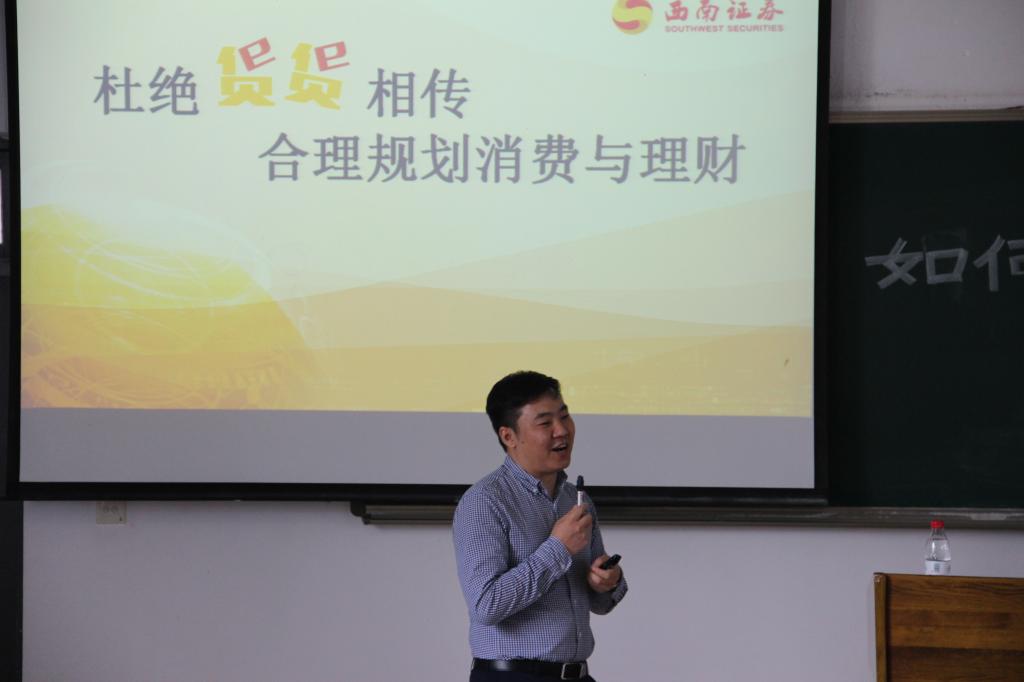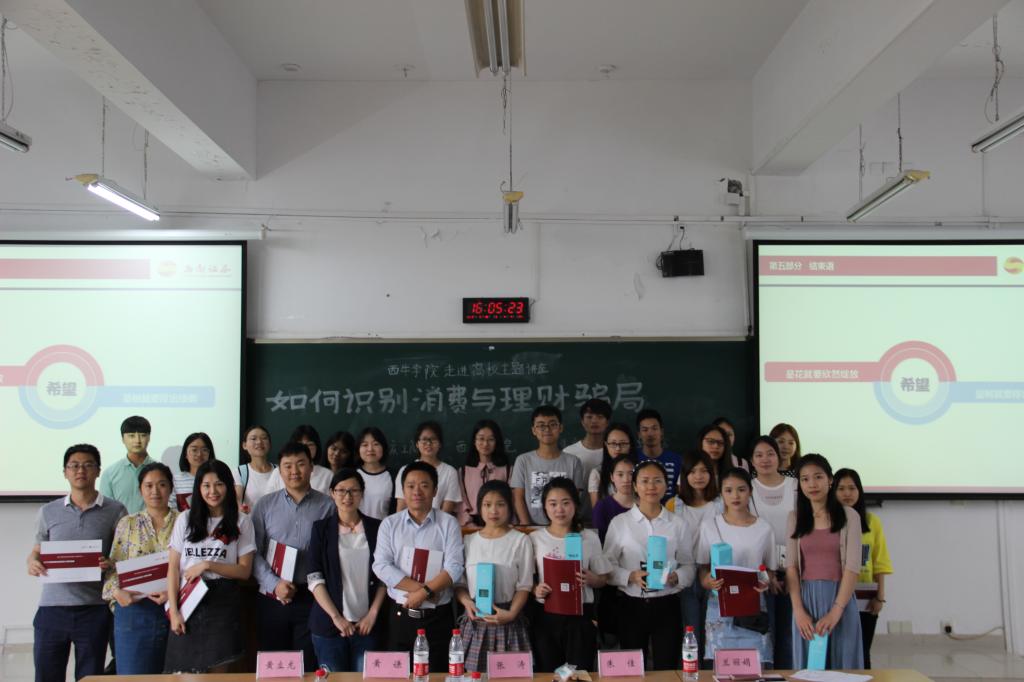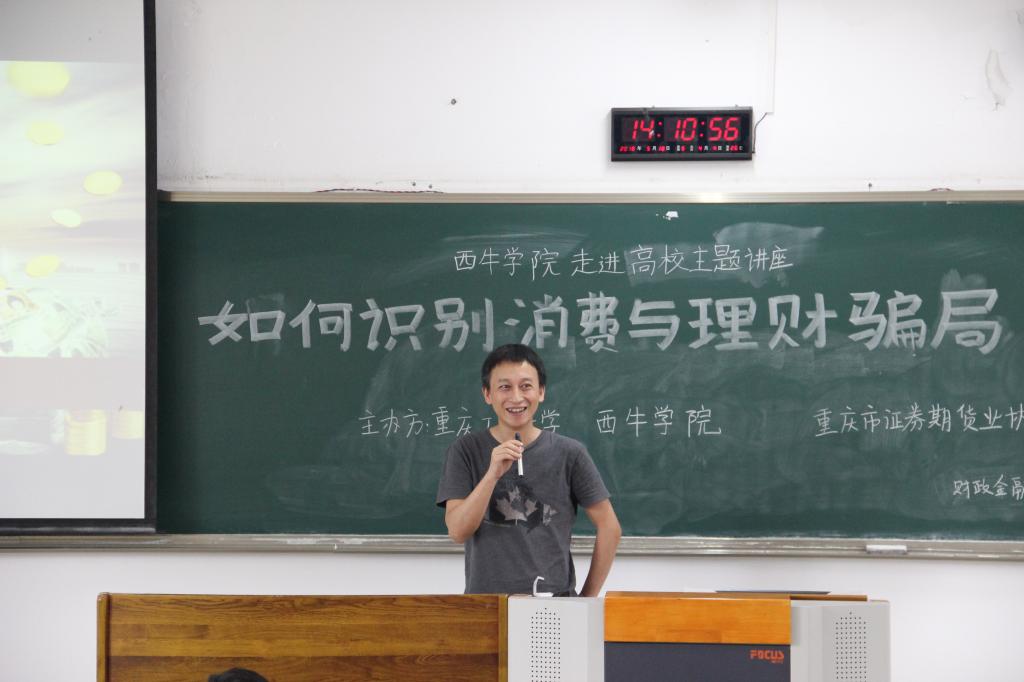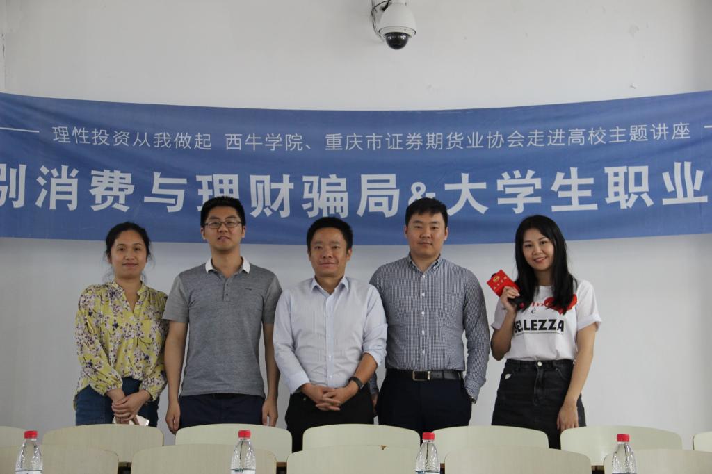 为使大学生了解金融市场风险、提高识别金融骗局的能力,同时为大学生提供就业规划、职业发展的指导与建议,5月18日下午2点,西南证券国家级互联网投教基地“西牛学院”、重庆市证券期货业协会和2138CC太阳集团财政2138CC太阳集团在博智楼207联合举办了“如何识别消费与理财骗局暨大学生职业发展交流”的主题讲座。西南证券财富管理中心副总经理张涛、西南证券财富管理中心产品经理黄立龙、重庆市证券期货业协会培训部主任朱佳、财政2138CC太阳集团分党委副书记黄谦以及学团办主任兰丽娟作为嘉宾莅临了本次讲座。