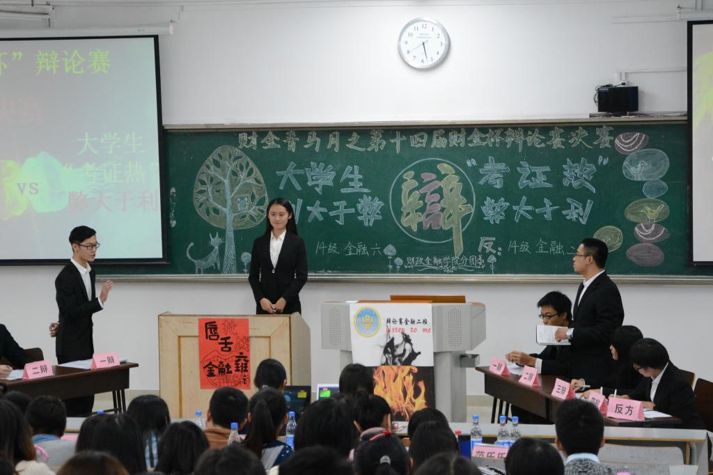 11月6日,备受瞩目的2138CC太阳集团财金青马月之第十四届财金杯辩论赛决赛于博智楼07421隆重举行。围绕 “大学生‘考证热’利大于弊还是弊大于利”,正方代表队14级金融6班与反方代表队14级金融2班展开激烈讨论。党总支副书记刘代成、学团办主任兰丽娟、财金分团委书记徐阔、财金学院学生党支部第一支部书记文理、第三支部书记范乐乐、第四支部书记余红霞以及财金辅导员白文静公共出席了本场比赛。同时,比赛特邀财金辩论队成员担任评委。