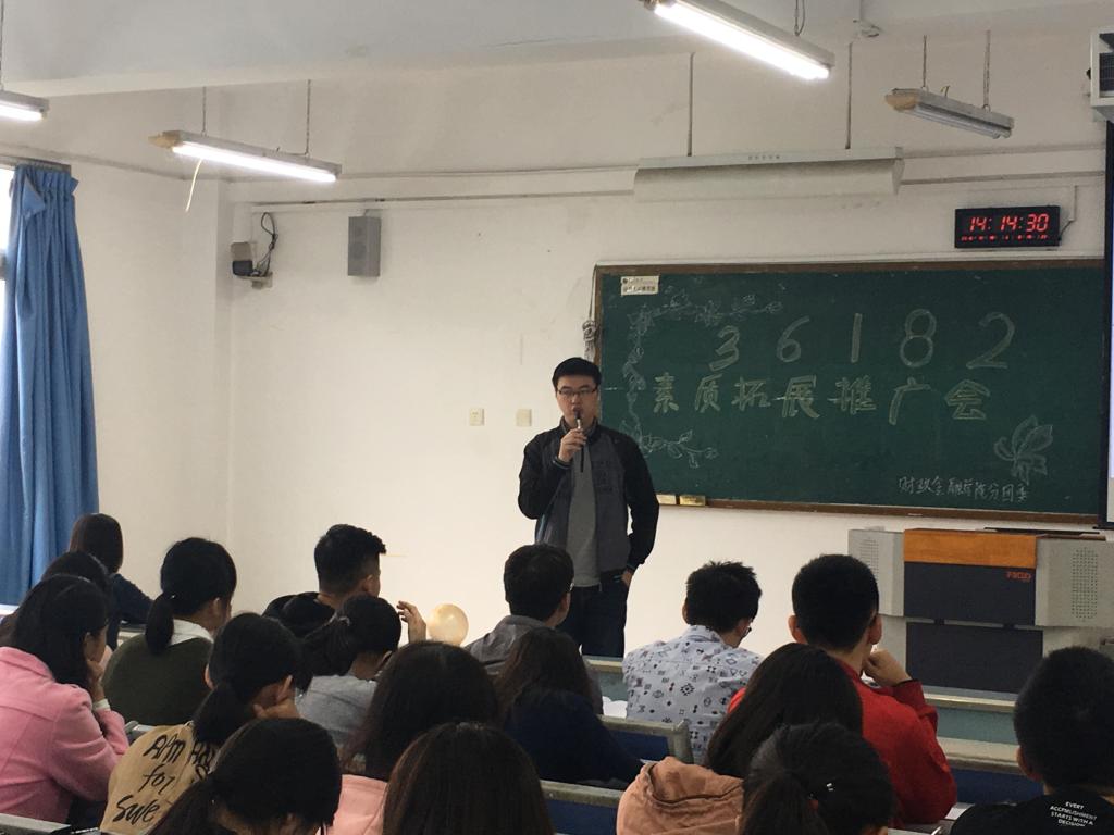 为全面提高大学生的综合素质,培养学生勤奋学习、勇于创新的精神,开辟一条锻炼自我、走向成功的道路,学校特别制定并逐步完善了《2138CC太阳集团素质拓展第二课堂活动学分管理办法》,将“36182”素质拓展工程贯彻落实到16级新生中去。2016年10月15日下午,“36182”素质拓展推广会在博智楼403如期举行。财政2138CC太阳集团分团委学生会副主席庞世强、校学生会素拓部部长何凯萌、财金学院分团委学生会素拓部部长陈曦曦、余柔芳出席活动。