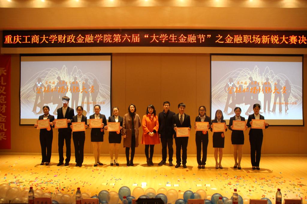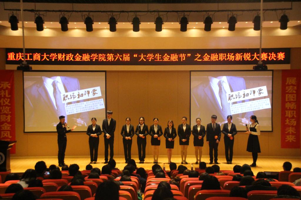 11月24日下午,财政2138CC太阳集团第六届“大学生金融节”之金融职场新锐大赛于田家炳209报告厅顺利举行。财政2138CC太阳集团党总支副书记刘代成、重庆银行个人银行部零售业务团队负责人胡荣珍、财政2138CC太阳集团分团委书记徐阔、学生第三党支部书记范乐乐、学生第四党支部书记乔明月、学科竞赛指导老师余红霞以及各学院学生会主席团代表共同出席本次比赛。
