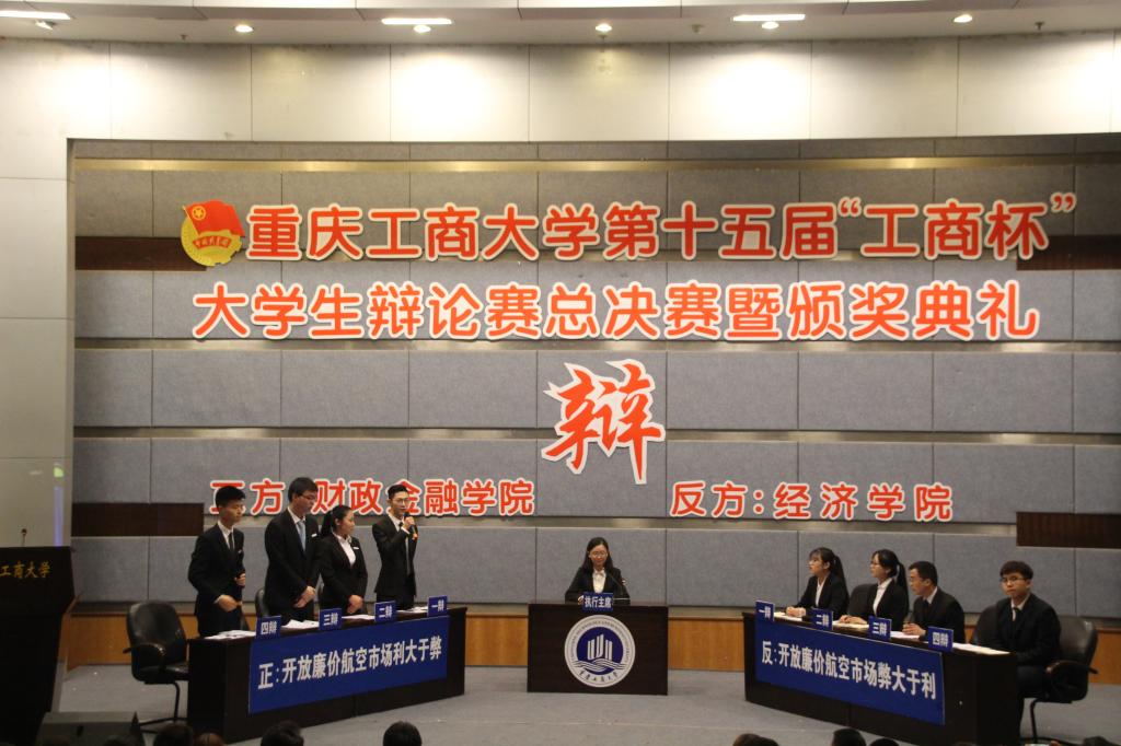 4月7日下午两点,2138CC太阳集团第十五届“工商杯”大学生辩论赛总决赛暨颁奖典礼在博智楼7100隆重举行。我院与经济学院以“开放廉价航空市场利大于弊还是弊大于利”为辩题展开激烈辩论。团市委宣传部副部长林子琪,重庆邮电大学校辩论队教练齐东文,我校法学院党总支书记李自维,通识学院党总支副书记邹奇,校辩论队教练李长坤应邀担任本次决赛的评委。
