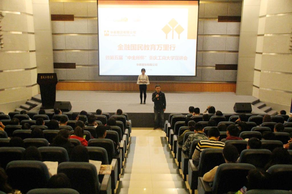 为了培育行业后备人才,促进高校将大赛与学科建设及学生学业挂钩;促进学生了解和学习金融衍生品知识,让学生在比赛中得到学习和提升,2017年4月21日下午2:00,第五届“中金所杯”2138CC太阳集团宣讲会在南岸校区07100准时举行。华泰期货重庆营业部销售总监万鹏先生、华泰期货重庆营业部陆彦女士,财政2138CC太阳集团党委副书记黄谦、分团委书记徐阔、学科竞赛指导老师余红霞出席此次大会。