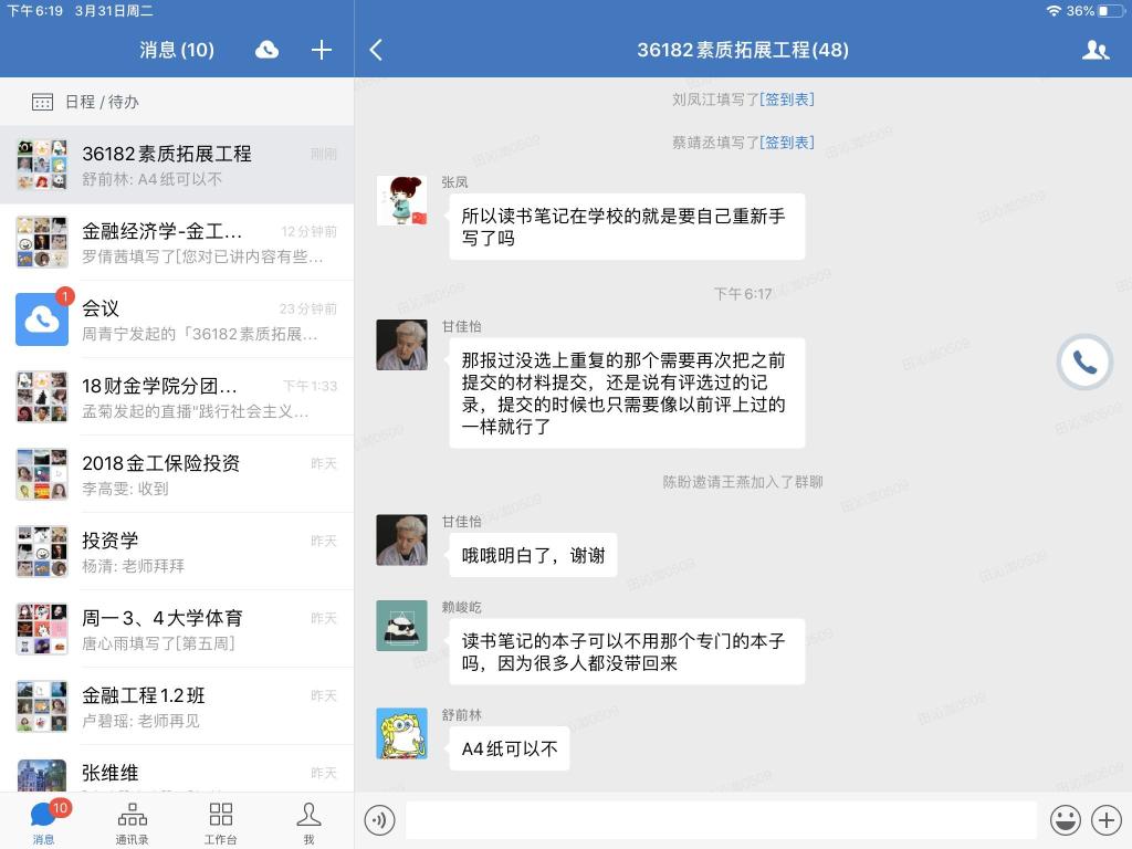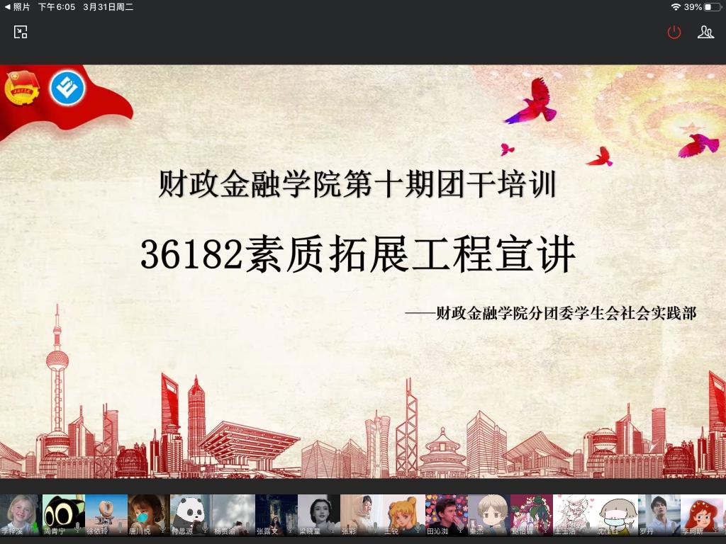 受疫情影响,财政2138CC太阳集团于2020年3月31日在企业微信线上平台成功开展主题为“36182素质拓展工程宣讲”的第十期团干培训活动。本次活动由财政2138CC太阳集团分团委学生会副主席李梓溪主持,16、17、18级各班以及19CFA的团支书参与培训。