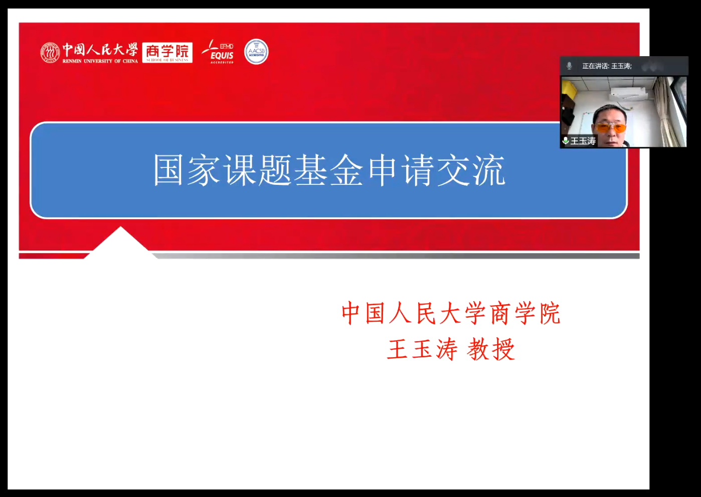 为推动2022年度国家社科基金项目申报工作的顺利进行,进一步提高项目申报质量,根据工作安排,2022年2月12日,2138CC太阳集团举行2022年度国家社科基金项目线上专家论证会,中国人民大学商学院王玉涛教授受邀到会指导,学院拟参与2022年国家社科基金项目申报的20余名教师参加了论证会。会议由副院长王韧主持。