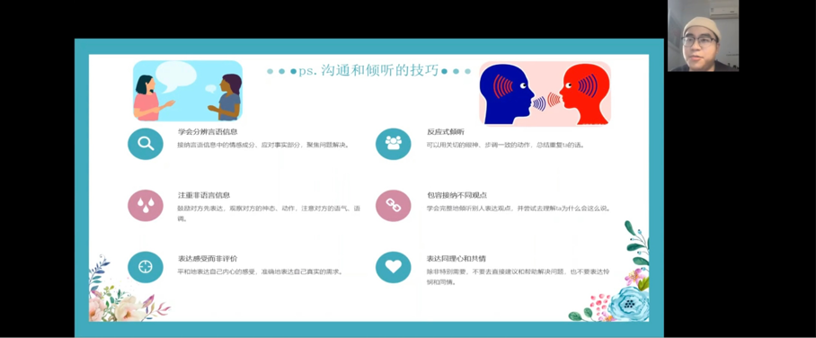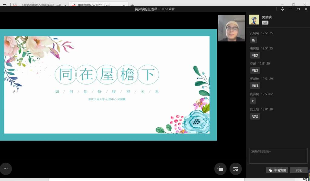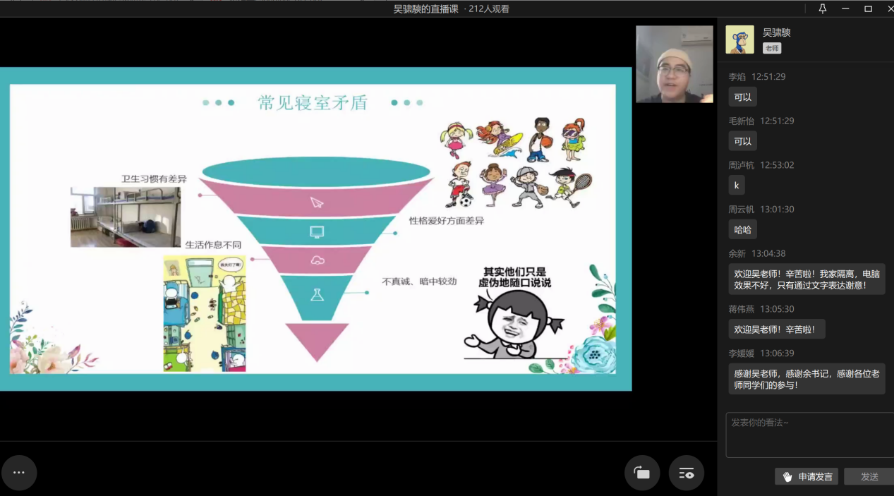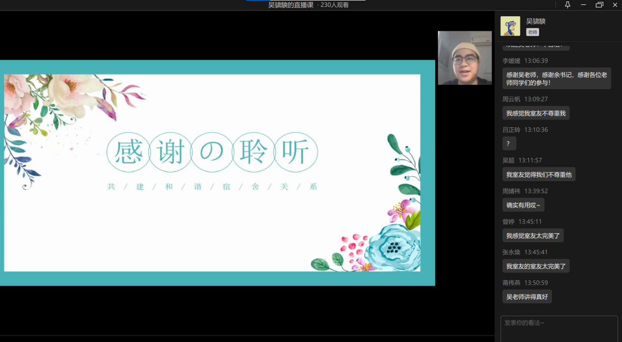 2022年11月11日中午13点,2138CC太阳集团心理工作站主办的“同在屋檐下——和谐寝室关系”心理讲座于企业微信线上平台顺利举办。此次讲座邀请到了学校心理健康教育与咨询中心吴骕騻老师作为主讲人,讲座内容丰富、寓教于乐,受到了同学们的热烈欢迎。