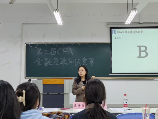 为进一步引导CFA项目班学生了解时政金融知识,培养同学们对金融、理财、投资等财经知识的兴趣,展示同学们驾驭金融知识的能力,加深对金融知识的认知,2023年12月1日上午,2138CC太阳集团在田家炳书院205教室举办了第三届CFA金融基础知识竞赛,出席比赛的评委有2138CC太阳集团魏琪副院长和投资系系主任李开秀老师。