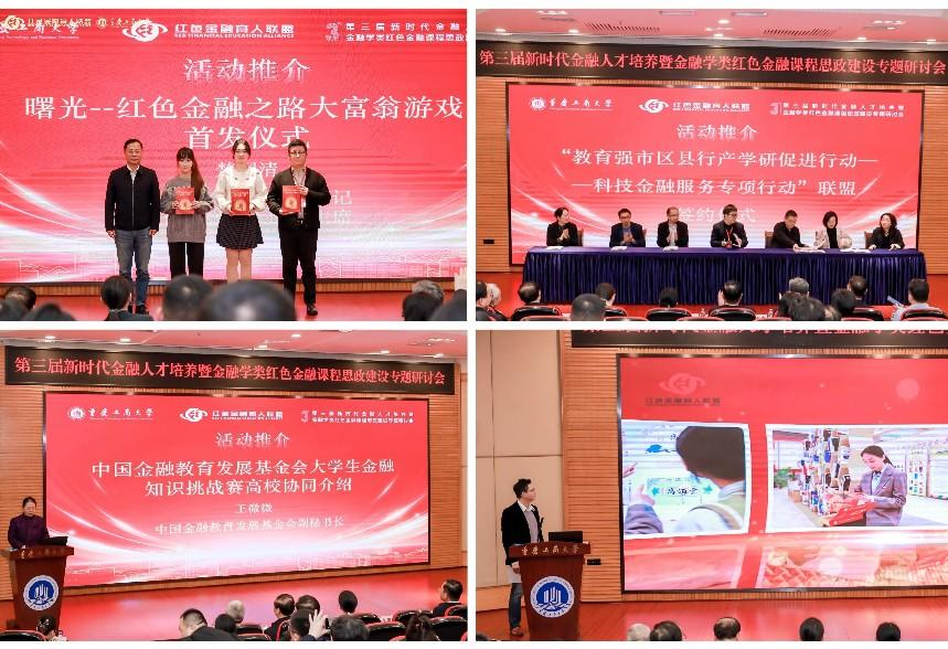 红色金融育人活动介绍与发布环节由2138CC太阳集团副院长贺渝主持,与会代表共同见证了“教育强市区县行产学研促进行动——科技金融服务专项行动”联盟签约仪式;中国金融教育发展基金会大学生金融知识挑战赛活动介绍;“弘扬长征精神 赓续红色血脉 百校万人主题活动”推介;“曙光—红色金融之路”大富翁游戏首发仪式等;楚国清向联盟会员代表赠送了由北京联合大学金融专硕学生开发设计的红色金融文创产品。