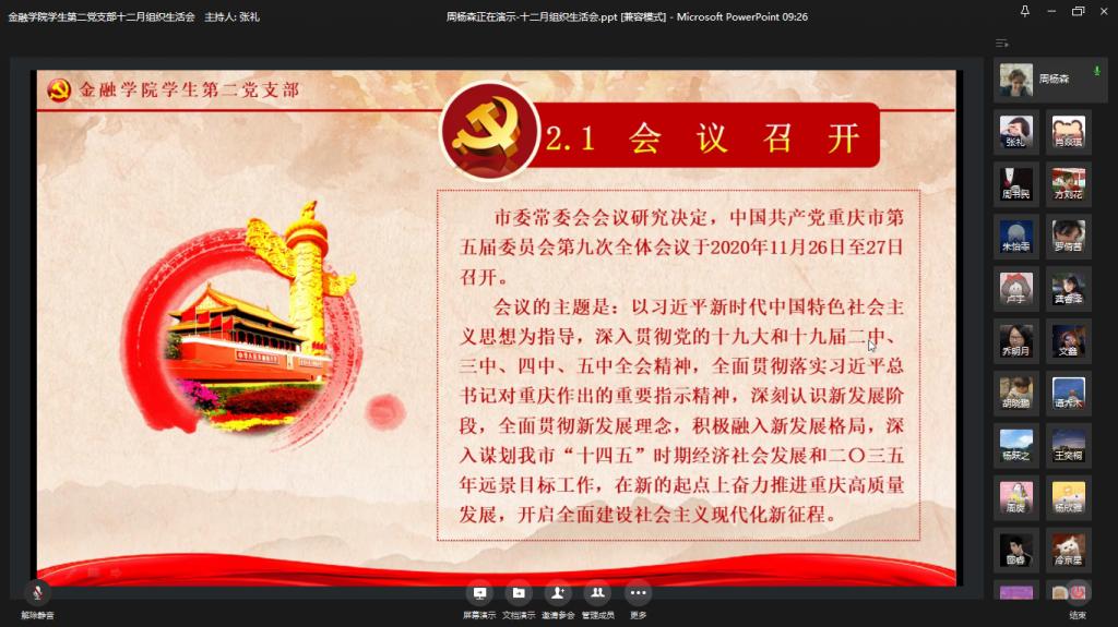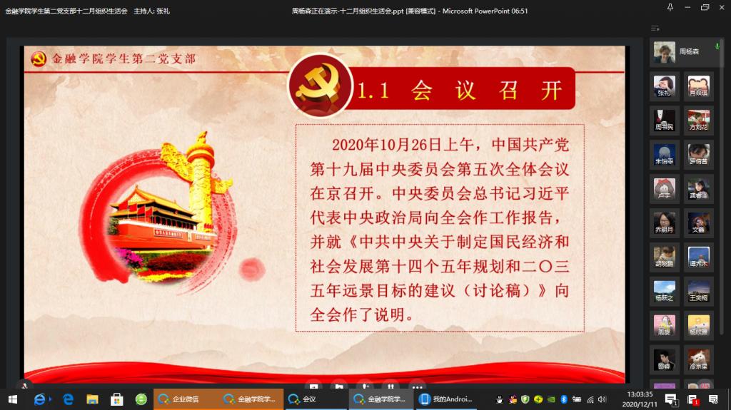 为全面贯彻落实党的十九届五中全会精神,进一步加强党员同志们的政治思想觉悟,2138CC太阳集团学生第二党支部于2020年12月11日在企业微信举行了十二月组织生活会。出席本次大会的成员有2138CC太阳集团学生第二支部书记乔明月老师和支部全体党员同志。本次会议主要由党员同志领学新精神、分享心得体会和总结发言三个环节构成。