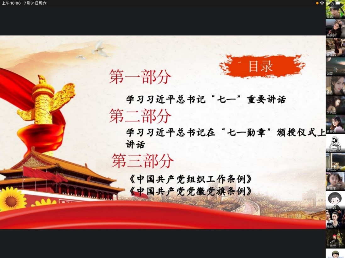 会议正式开始,本次会议由尚飒同志担任领学人。学习内容分为以下三个板块:一、学习习近平总书记七一重要讲话。二、学习习近平在“七一勋章”颁授仪式上的讲话。三、《中国共产党组织工作条例》、《中国共产党党徽党旗条例》。