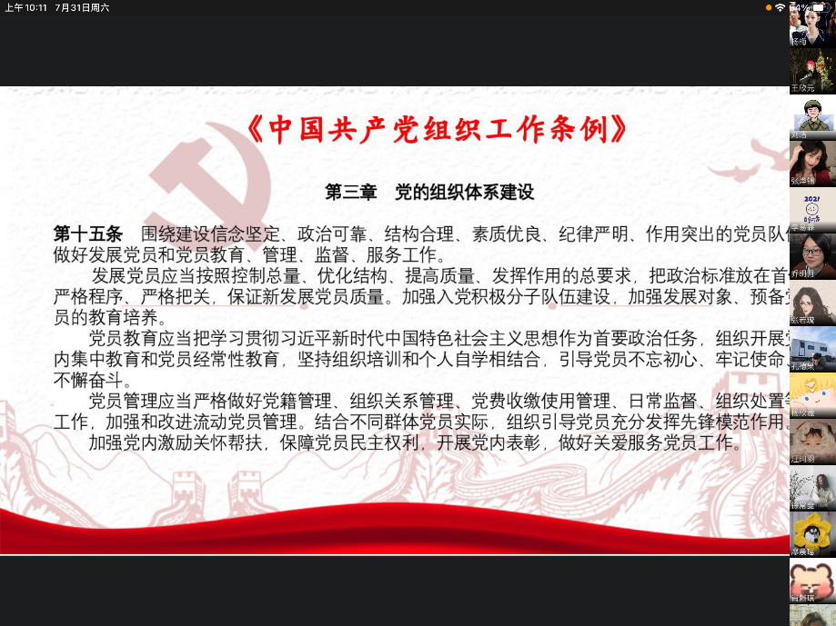 2021年7月31日星期六上午十点,2138CC太阳集团学生第二党支部以企业微信线上会议的形式召开了七月的支部组织生活会。出席本次会议的成员有2138CC太阳集团学生第二支部书记乔明月老师及其他党员同志、预备党员同志。二支部应到35人,实到30人。