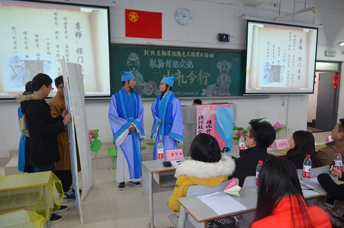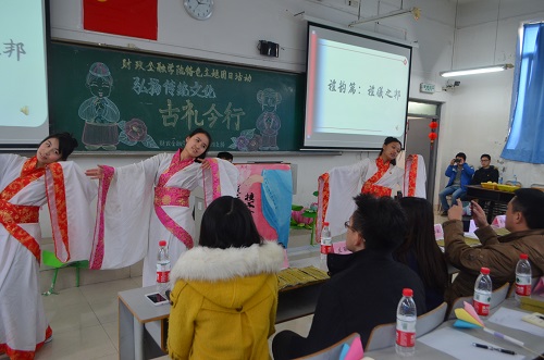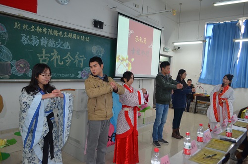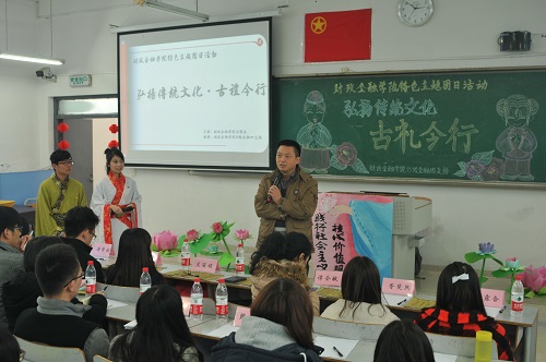 为培育和践行社会主义核心价值观,提升学生人文道德素养,财政2138CC太阳集团2013级金融四支部于2014年12月18日下午在博智楼406教室举办了“弘扬传统文化——古礼今行”特色主题团日活动。财政2138CC太阳集团党总支刘代成副书记、分团委书记兰丽娟老师、辅导员谭会敏老师以及校团委学生会组织部成员、财政2138CC太阳集团分团委学生会主席团成员作为嘉宾莅临活动现场。