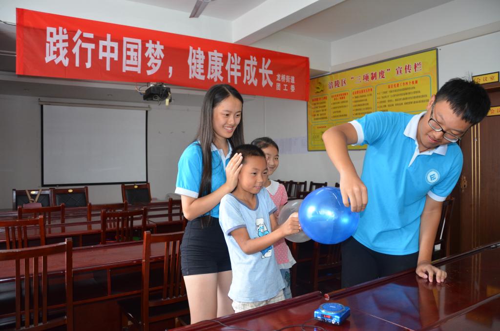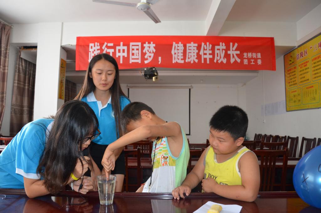 7月22日午后,载着雨后初晴,2138CC太阳集团财政2138CC太阳集团创新创业服务团来到涪陵区龙桥街道北拱社区与龙桥街道青年志愿者一起开展“见证奇迹”科普小课堂,为孩子们开启了探索之旅。