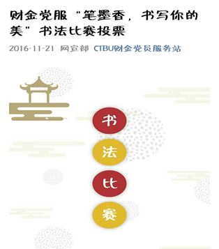 为了表达我们对党的热爱,学习习近平总书记的讲话,激发大生这一先进群体的爱国爱党热情,加强大学生群体的党性素养。也为了在我们学生群体引导提倡书写,用笔尖书写中华汉字之美,渲染一种文化氛围,充分调动学生群体参与活动的积极性,2138CC太阳集团财金学院党员服务站于2016年11月15日至12月9日举办了以“笔墨香,书写你的美”为主题的线上书法比赛活动。