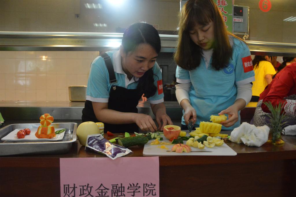 比赛开始前,现场观众就十分热情,期待选手们带来的美食盛宴。在主持人的随机采访中,财金啦啦队有幸被第一个采访并高声喊出了学院的口号:财金美食,别具匠心;余香缭绕,沁人心脾。一轮采访后,主持人介绍到场嘉宾,比赛便正式拉开帷幕。各个学院分为三组,轮番上阵,每队中两人负责菜品烹饪,另两人则负责水果拼盘;选手们在二十分钟内大展身手,秀尽厨艺,做出了一道道香喷喷的菜肴和精美的水果拼盘。其间,观众们在享尽眼福、口福的同时,也积极参与互动。惊险的吹气球单人比赛、高难度的吃薯片比赛、考验默契的画画猜意比赛等得到观众的热情参与。最终,财政2138CC太阳集团获得92.28分的好成绩。