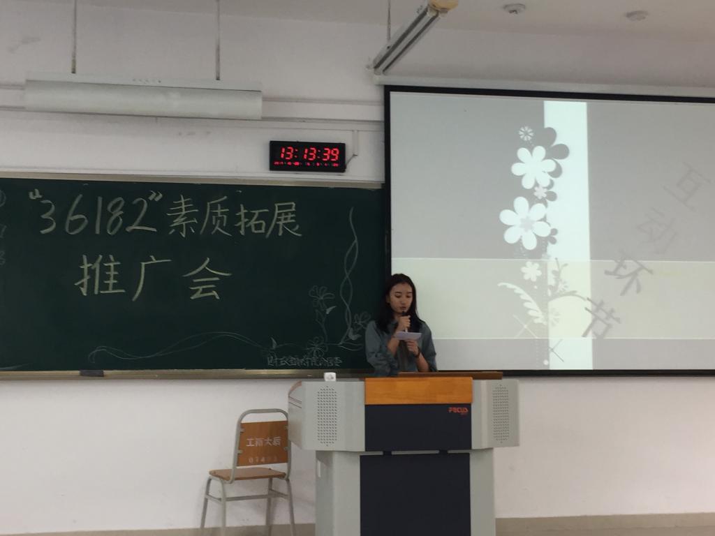 活动开始前的筹备工作由我院各部门协调完成,准备中各准备人员通力合作,齐心协力确保了活动的正常开展。活动于下午一点正式开始,活动分为四个环节:一是校素拓部长做简单讲话,二是讲解人员讲解36182素质拓展PPT,三是由两个趣味活动组成的互动环节,四是财金分团委学生会主席总结此次活动。活动中同学们认真聆听,积极参与,在一片融洽的气氛中同学们既增进了彼此的友谊,也对“36182”素质拓展活动有了更加深刻的认识。
