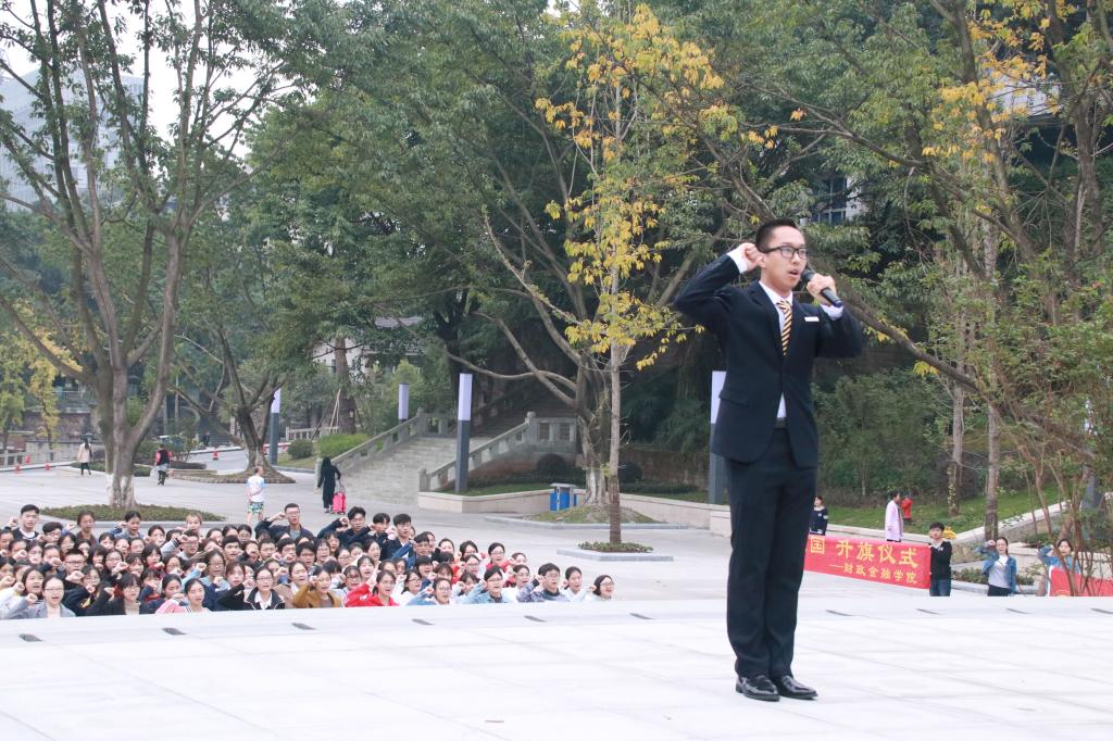 为了进一步践行党的十九大精神,弘扬“中国梦”,提高同学们的思想道德素质,激发广大师生的爱国之情,2017年11月13日清晨,由党委学工部主办,财政2138CC太阳集团承办 的“旗心爱国”升旗仪式于校前广场隆重举行。学工部、学生处石世明处长,财政2138CC太阳集团分党委黄谦副书记,学院党政办主任陈春洁老师,辅导员杨宁老师,乔明月老师以及财政2138CC太阳集团200余名入党积极分子参加此次升旗仪式。