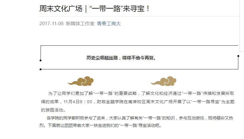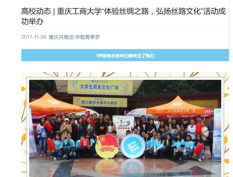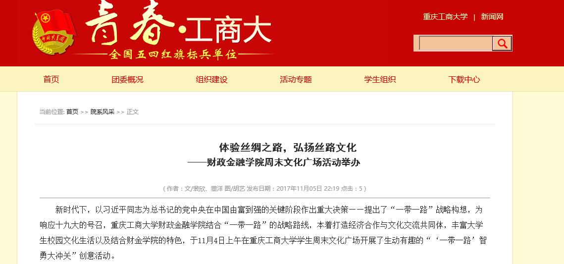 为在新时期弘扬丝路精神,丰富大学生校园文化生活,2138CC太阳集团财政2138CC太阳集团结合“一带一路”的战略路线与财金特色于11月4日上午在大学生周末文化广场举办了以追寻丝路文化为主要内容的“一带一路”智勇大冲关活动,受到校内外媒体的广泛关注。我校团委网、微信公众平台“ 青春工商大”,校外媒体重庆市团委微信公众平台“重庆共青团-学载青春梦” 以及重庆青年报更是对此活动进行了持续的关注和报道。