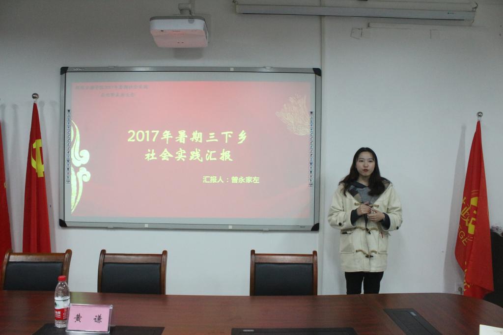 大会伊始,徐阔老师肯定了此次实践活动的累累硕果,并结合时代形势,讲述了实践的重要性,鼓励同学们在实践中学有所用,提高竞争力。紧接着,学生会代表曾永家左对2017暑期三下乡社会实践进行汇报总结,九龙坡“暑期嘉年华”支教小分队负责人李海明、“多彩童年,快乐暑期”兴趣拓展小分队负责人向森渝、农业金融扶贫攻坚调研团石柱代表对成员刘菊向与会人员分享了他们的所行所感。