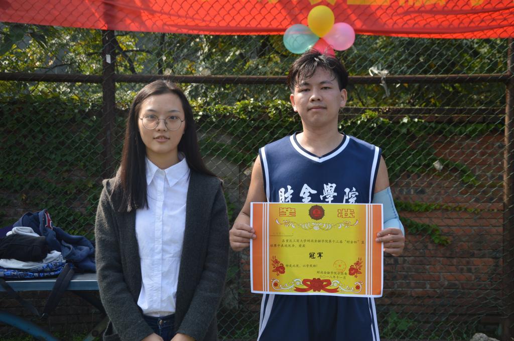 2018年11月1日中午第十三届“财金杯”篮球赛在北操篮球场举行了颁奖典礼暨闭幕式。17CFA保险队、大四联队、15联队和16金融队于艳阳普照的篮球场上为最后的冠军展开激烈的角逐。最终,大四联队以24:38的比分荣获冠军,17CFA保险队荣获亚军,15联队以比分35:31荣获季军。闭幕式上,最佳组织奖、道德风尚奖的得主们抢先揭晓,他们分别是:17金工,16投税财。最后,由文鑫获得最有价值球员奖。