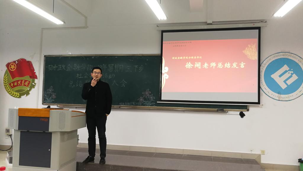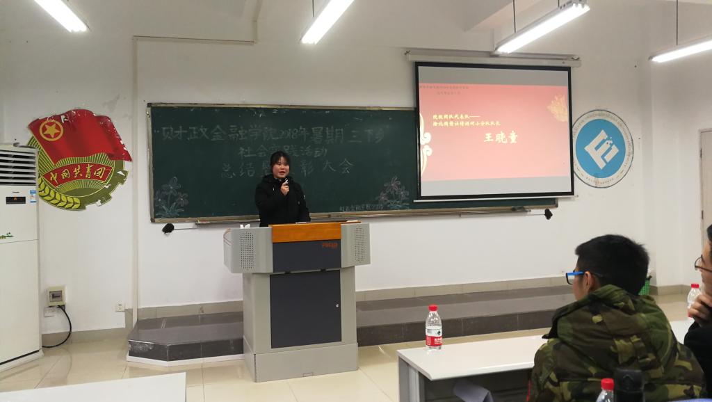 首先,徐阔老师上台对社会实践活动进行总结发言,对各实践分队给予了充分肯定和高度赞扬的同时,还提出两点希望:他希望社会实践要继续以宣传贯彻习近平新时代中国特色社会主义思想为主线,推动党的十九大精神进农村、进社区、进企业;他希望坚持社会实践主题要扩展到社会的方方面面,调动学生学习技能和本领的积极性,奠定坚实的工作基础,为实现伟大复兴的中国梦贡献青春力量。随后,财政2138CC太阳集团分团委学生会主席林哲苏同学上台分别从四个方面汇报了2018年学院社会实践总体情况,他还向大家展示了此次实践活动的荣誉并总结活动中的不足。 紧接着,来自九龙坡“暑期嘉年华”支教小分队负责人高明同学以及院级代表队——渝北国情社情调研小分队队长王晓童同学对暑期社会实践进行了分享交流,他们在老师的指导下,走进九龙坡区金凤镇支教、进入基层探访调研、深入乡村寻求问题,使学生们感受到了改革开放40年来祖国繁荣昌盛,更加坚定理想信念,争做新时代先锋。最后,财政2138CC太阳集团分团委书记徐阔老师、财政2138CC太阳集团分团委(学生)副书记书记陈露同学分别为受表彰学生代表颁发荣誉证书,激励同学们弘扬社会实践精神,传承财金良好风尚。