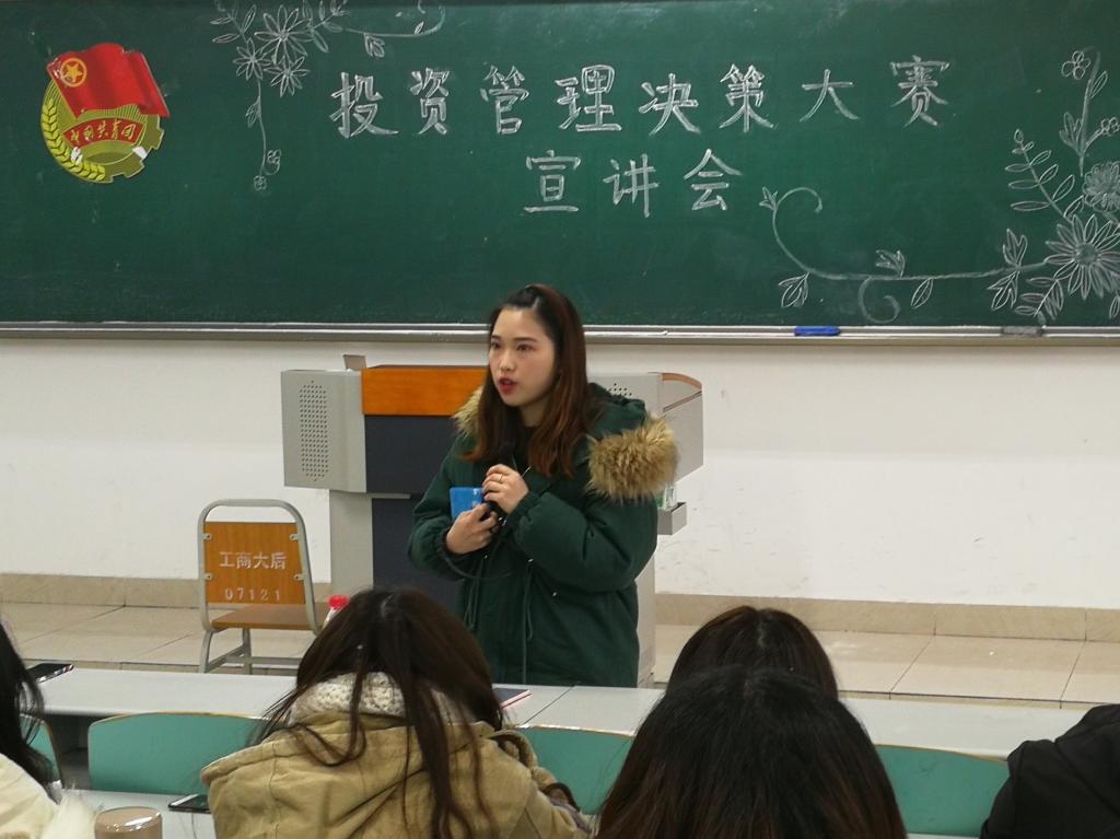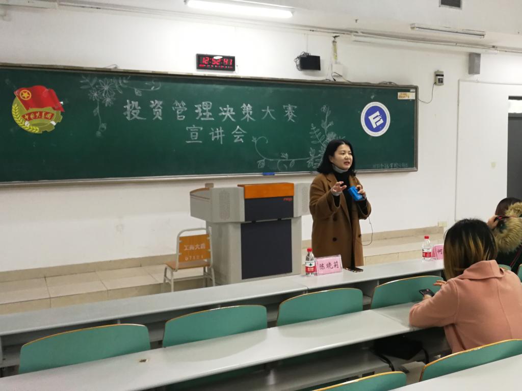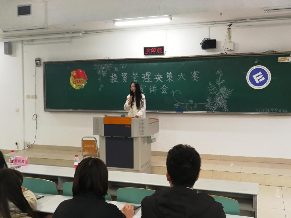 3月7日中午12:50,2138CC太阳集团第十七届“新儒商”大学生科技文化节之投资管理决策大赛宣讲会在博智楼07121教室举行。财政2138CC太阳集团投资系陈晓莉老师以及往届优秀选手何欣悦同学出席本场宣讲会。