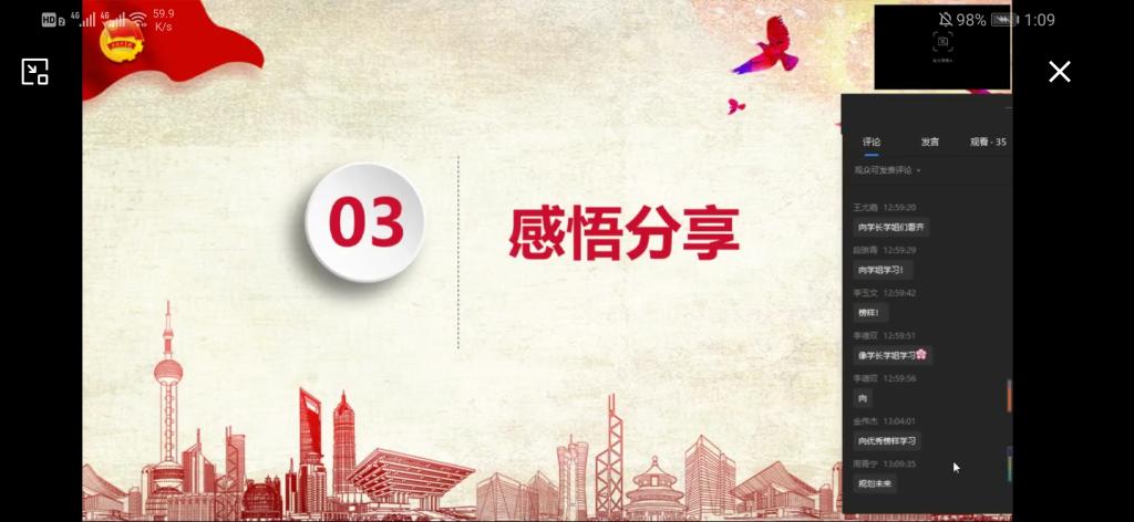 活动进入了最后的感悟分享环节,虽然不能面对面的进行交流,但是在字里行间,都能够感受到大家为了实现中华民族伟大复兴的中国梦所立下的远大志向和目标的赤诚之心。