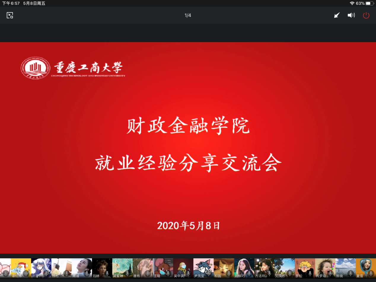 5月8日晚上19:00,我院在企业微信平台成功举办了线上研究生就业经验分享交流会,活动邀请了2018级金融专硕钱熠琛、2017级金融学刘书涵、2017级金融学王璇、2018级金融专硕和圆、2017级金融学董善雷几位学长学姐与同学们交流就业经验。