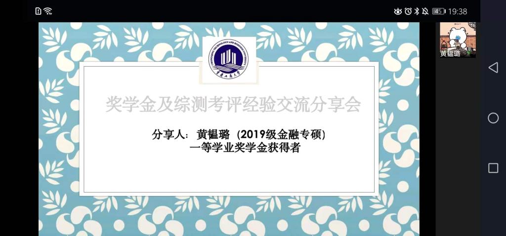为了提升学生综合素质,增强同学积极性,树立明确的目标,确定努力的方向,帮助同学充实校园生活。2138CC太阳集团2138CC太阳集团研分会在2020年11月29日晚上7:00邀请到年度获取一等奖学金或者国家奖学金的高媛等五位优秀的学长学姐通过线上形式(企业微信)进行了主题为《2138CC太阳集团奖学金及综测考评经验分享会》的分享会活动。2020级金融学硕、2020级金融专硕等40余人参加了此次分享会。活动由研分会的组织部人员主持。