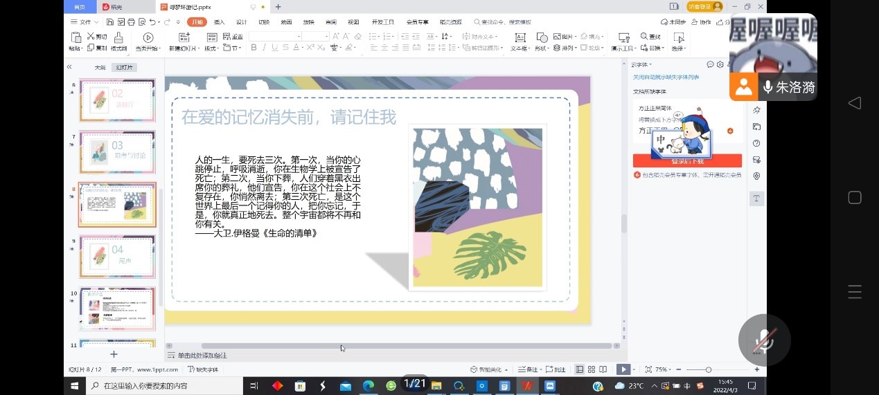 最后主持人总结了本次活动。她提醒我们,死亡不是永别,忘记才是。在寻梦的历险里,要铭记身后还有爱你的亲人们。有人记得你,你心里也仍有牵挂,这便是活着的莫大幸福和意义。