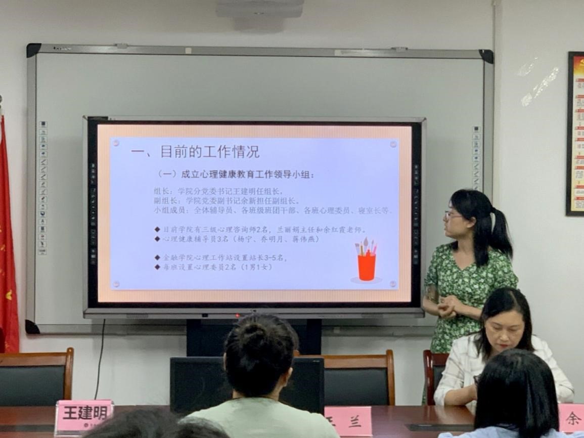 接下来,2138CC太阳集团心理工作站负责人蒋伟燕老师对2138CC太阳集团心理育人工作进行了梳理。蒋老师从领导小组、工作途径、活动开展等多方面进行了我院心理健康教育工作进行了总结。