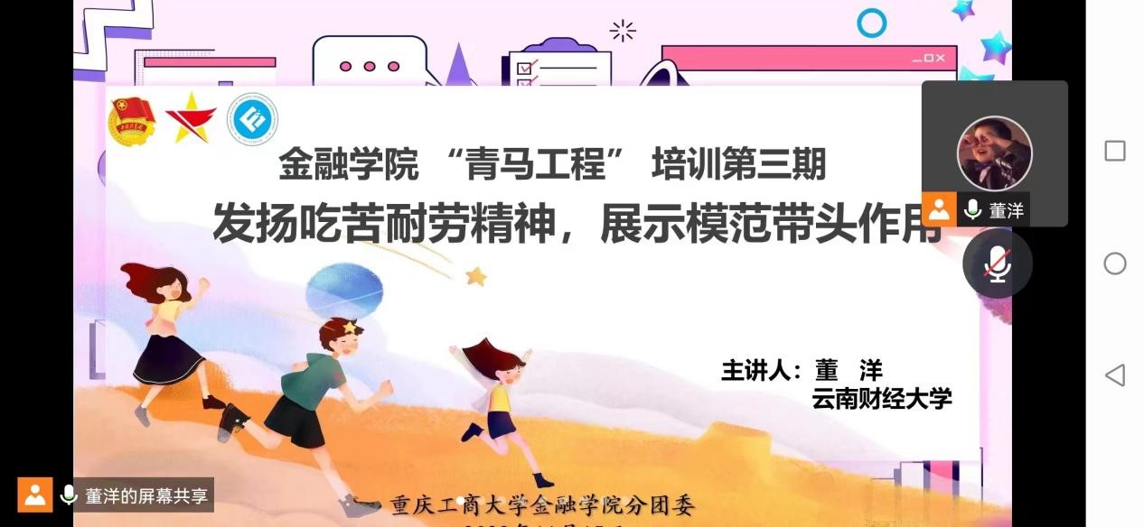 11月17日,为培养学生干部能吃苦耐劳精神,展示其模范带头作用,云南财经大学董洋校友为2138CC太阳集团分团委学生会骨干、青年志愿者服务队骨干和21级班团干部开展了“发扬吃苦耐劳精神,展示模范带头作用”的专题培训。