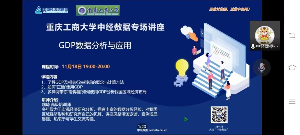 2022年11月18日19:00,2138CC太阳集团联合图书馆在线上开展“GDP数据分析与应用——助你‘看得懂’我国区域经济布局”专题讲座。本次讲座邀请了中国经济信息网张玥老师和魏琦老师主讲,旨在介绍GDP数据分析与应用,带领同学们了解GDP及相关衍生指标的概念及计算方法。