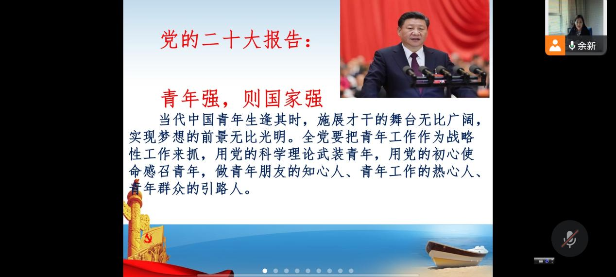 余新副书记围绕“青年强,则国家强”展开讲述,宣讲党的二十大报告关于青年的论述。我们党始终把青年工作作为战略性工作来抓,未来属于青年,希望寄予青年。广大青年要坚定不移听党话、跟党走,怀抱梦想又脚踏实地,敢想敢为又善作善成,立志做有理想、敢担当、能吃苦、肯奋斗的新时代好青年,让青春在全面建设社会主义现代化国家的火热实践中绽放绚丽之花。