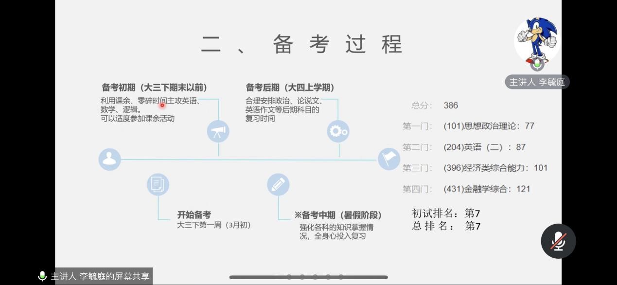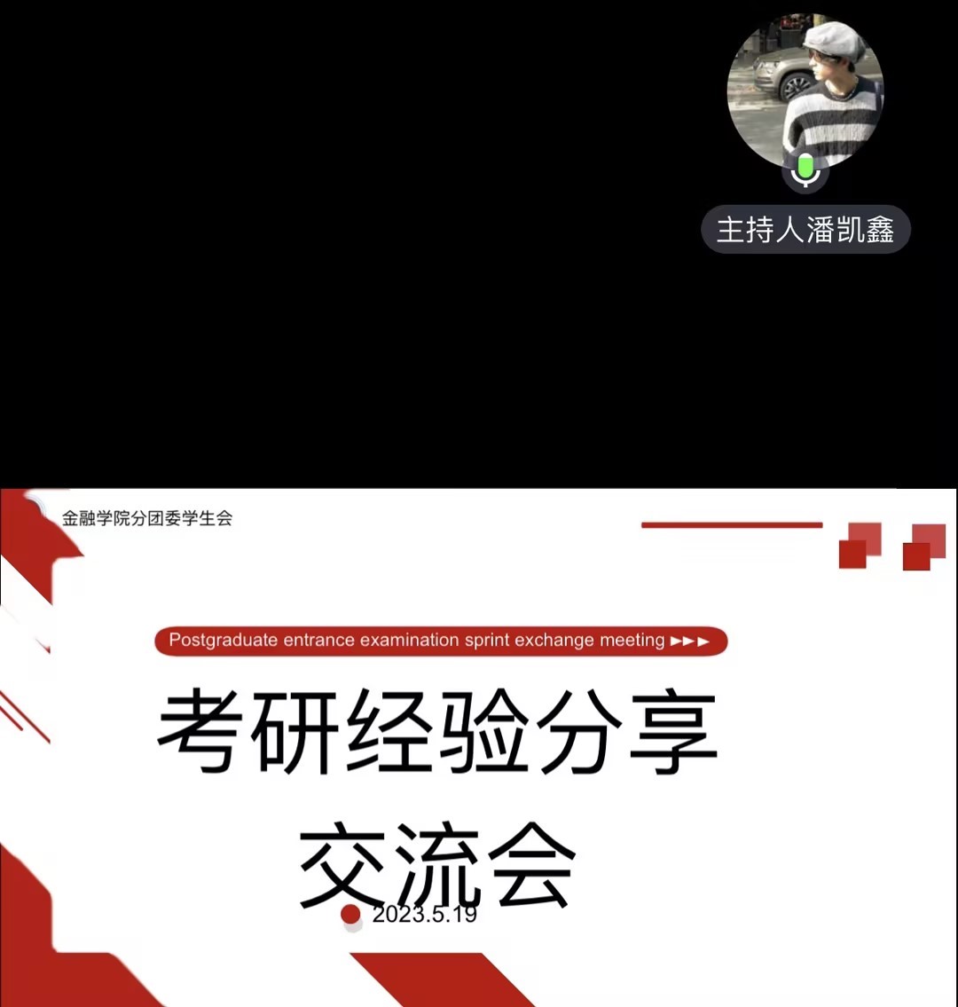 19金融工程二班王琴(对外经济贸易大学 国际经济贸易学院 金融学学硕)对选择报考学校、复习时间规划和一些公共课专业课经验做了详细的介绍。她着重讲到了自己在准备考试时的一些经验和规划,特别是对在不同的时间段复习的重点应该放到哪里,怎么复习可以效率更高这两方面进行了分享。她认为针对不同的科目应该要有不同的复习重点、复习策略。同时她也为大家推荐了一些合适优质的复习资源和渠道。