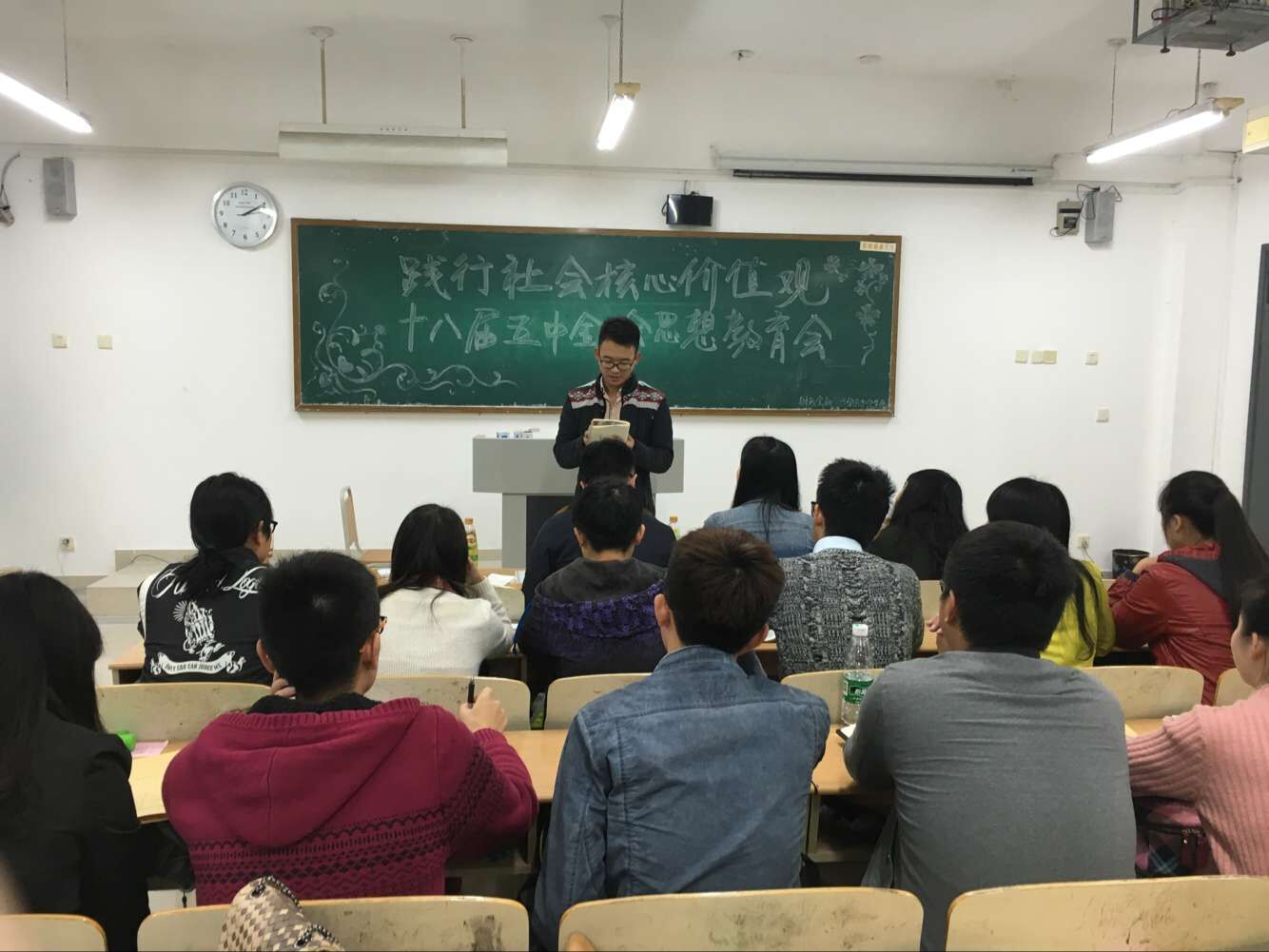 11月24日中午,财政2138CC太阳集团召开了以“践行社会主义核心价值观”为主题的十八届五中全会思想教育会。由财金学生副主席王庆峰作为主讲人,财金学生会主席团、部长代表及各班代表出席了本次会议。