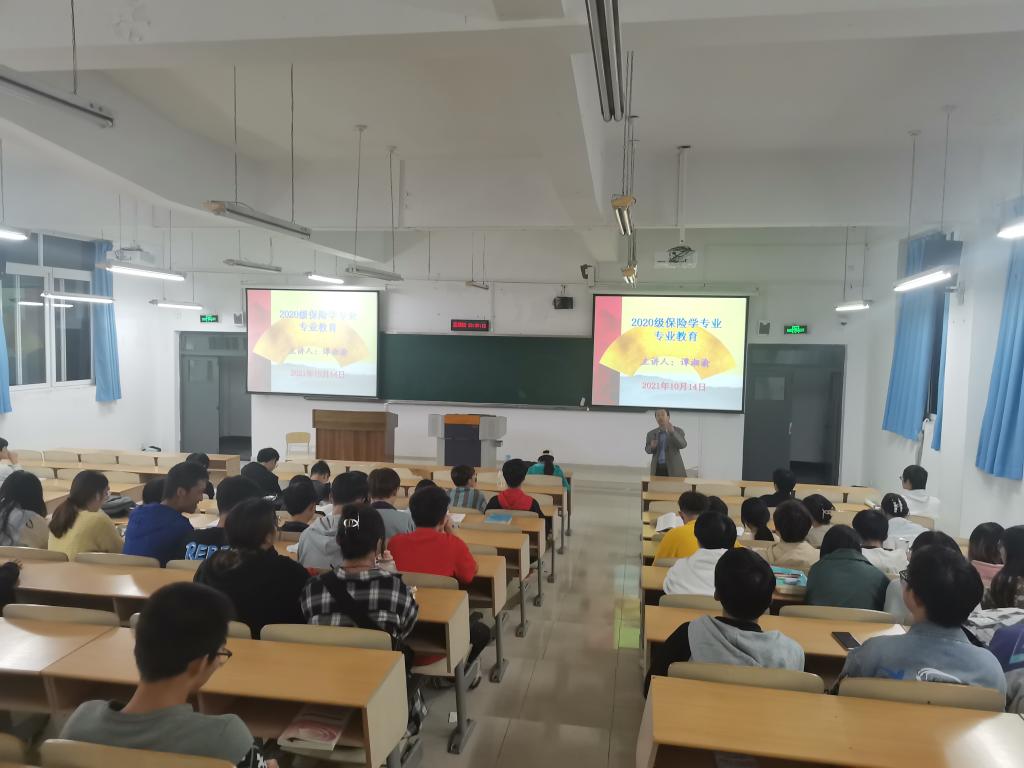 为了进一步适应金融学大类招生和二年级分流培养的新形势,增强学生对专业的认同感,2138CC太阳集团在各专业有序开展专业指导工作。2021年10月14日,保险学系主任谭湘渝教授为2020级保险学专业本科生进行了专业教育。
