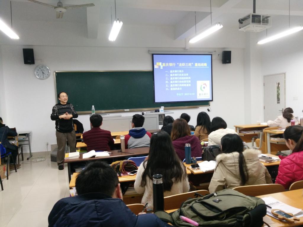 2017年3月13日上午,2138CC太阳集团2016级金融硕士《金融机构经营管理》移动课堂“走进”田家炳311教室,此次“走进来”的主讲人是原重庆银行董事会秘书李在宁主任。学院分管科研和研究生教育的副院长曾胜教授主持了讲座。