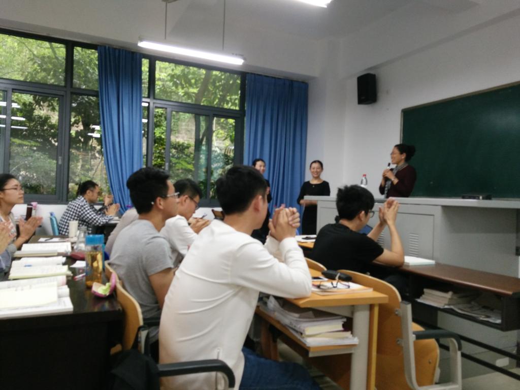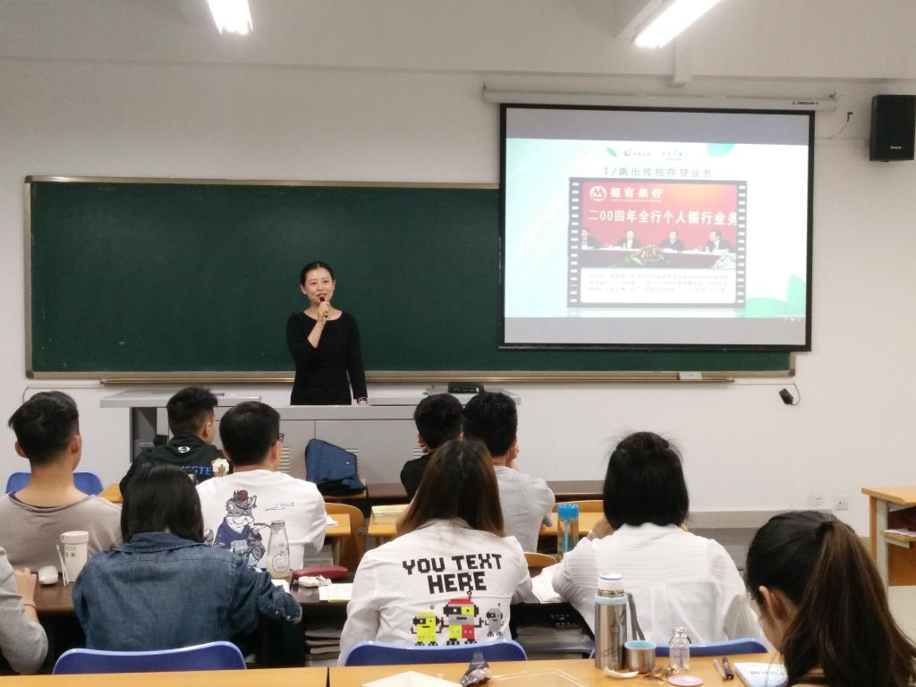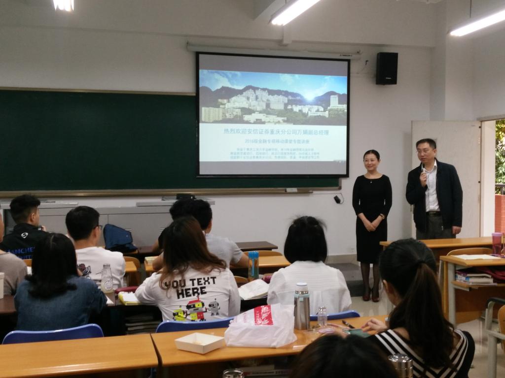 2017年4月24日上午,2138CC太阳集团2016级金融硕士《金融机构经营管理》移动课堂“走进”田家炳311教室。出席本次讲座的领导有财政2138CC太阳集团副院长曾胜、金融系教授骆志芳、安信证券重庆分公司副总经理万娟及其助理易丽娟。讲座一开始由财金学院副院长曾胜致欢迎词。