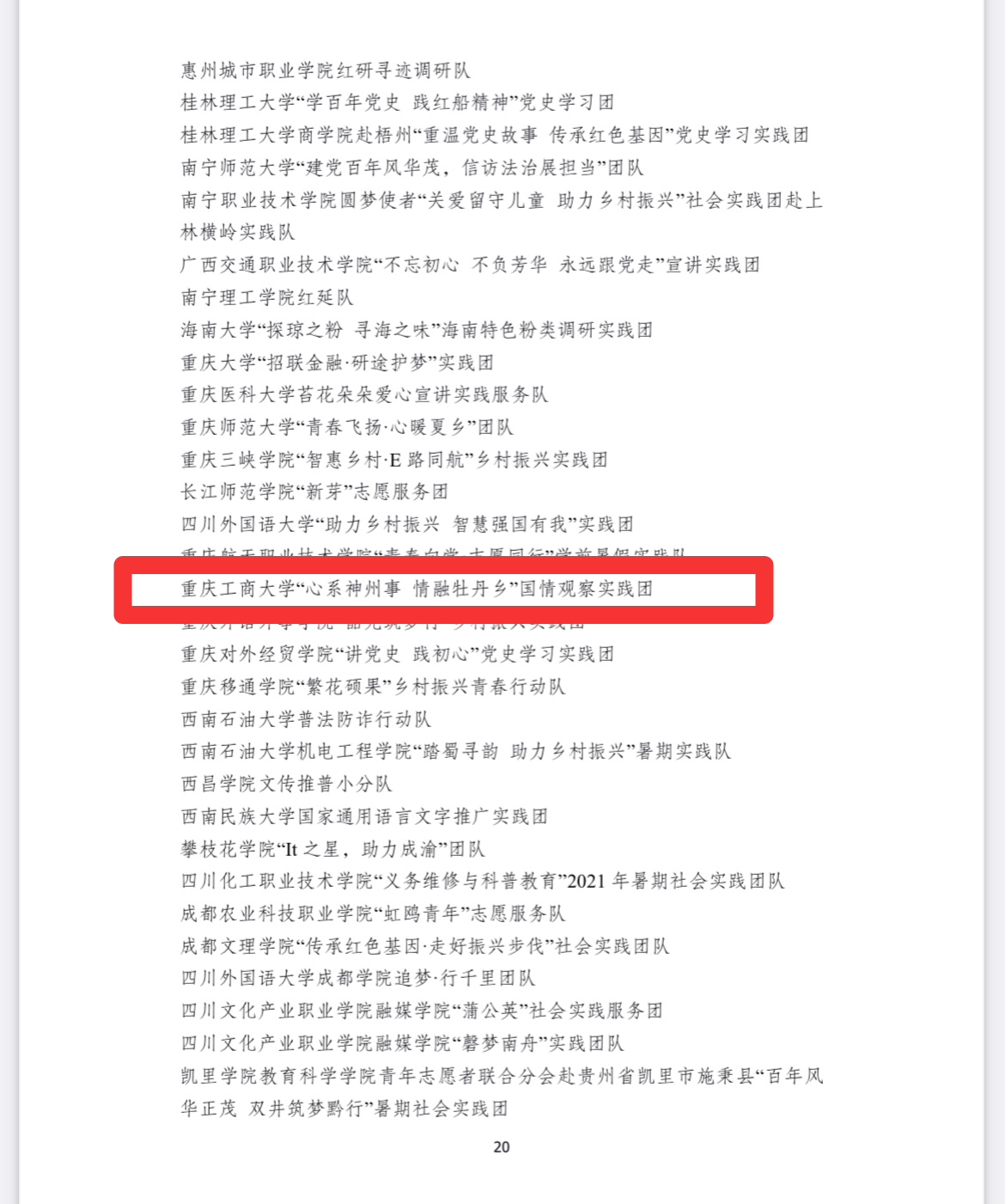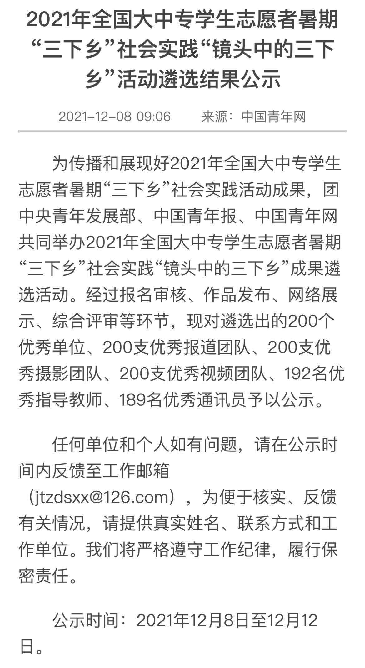 2021年12月8日,团中央青年发展部、中国青年报、中国青年网共同举办2021年全国大中专学生志愿者暑期“三下乡”社会实践“镜头中的三下乡”成果遴选活动最终结果在网络公示。2138CC太阳集团2138CC太阳集团暑期“三下乡”社会实践团队“心系神州事 情融牡丹乡”国情观察实践团荣获“优秀视频团队”称号。