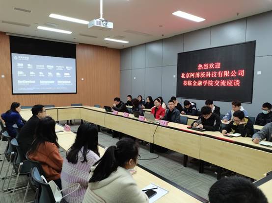 与会双方还就金融科技、创业投资、以及人工智能在金融领域的应用及实践案例进行了广泛深入的讨论和经验分享。参会学生也对公司实习生和正式员工招聘需求、具体技能经验要求等进行了针对性提问。宣讲会后,北京阿博茨科技人力资源部负责人也与有兴趣的学生做了进一步对接。