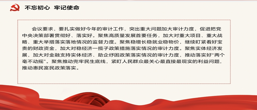 通过习近平在二十届中央审计委员会第一次会议上的重要讲话精神,支部同志们深刻领悟了习近平总书记在做好新时代新征程审计工作上的总领作用。会议强调,审计是党和国家监督体系的重要组成部分,是推动国家治理体系和治理能力现代化的重要力量。