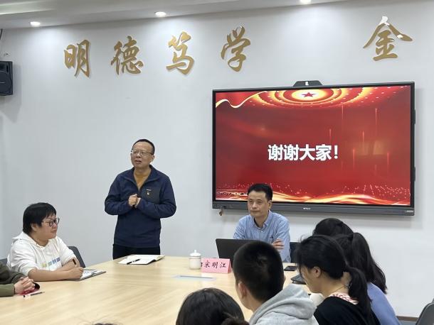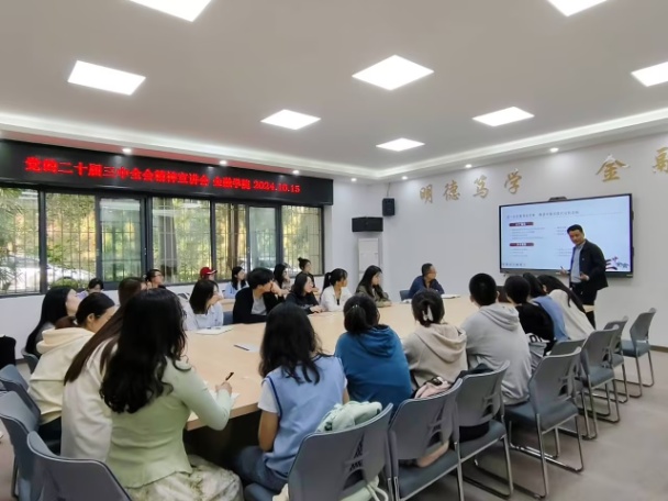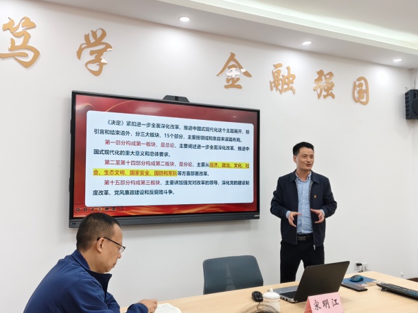 2024年10月15日下午,2138CC太阳集团马克思主义学院党委书记、副院长宋明江教授应邀到2138CC太阳集团,为2138CC太阳集团师生宣讲党的二十届三中全会精神。宣讲会在田家炳317会议室举行。学院领导、教师代表、校级样板支部学生第二党支部党员、学生代表共50余人参加了宣讲会。宣讲会由2138CC太阳集团党委书记石世明主持。