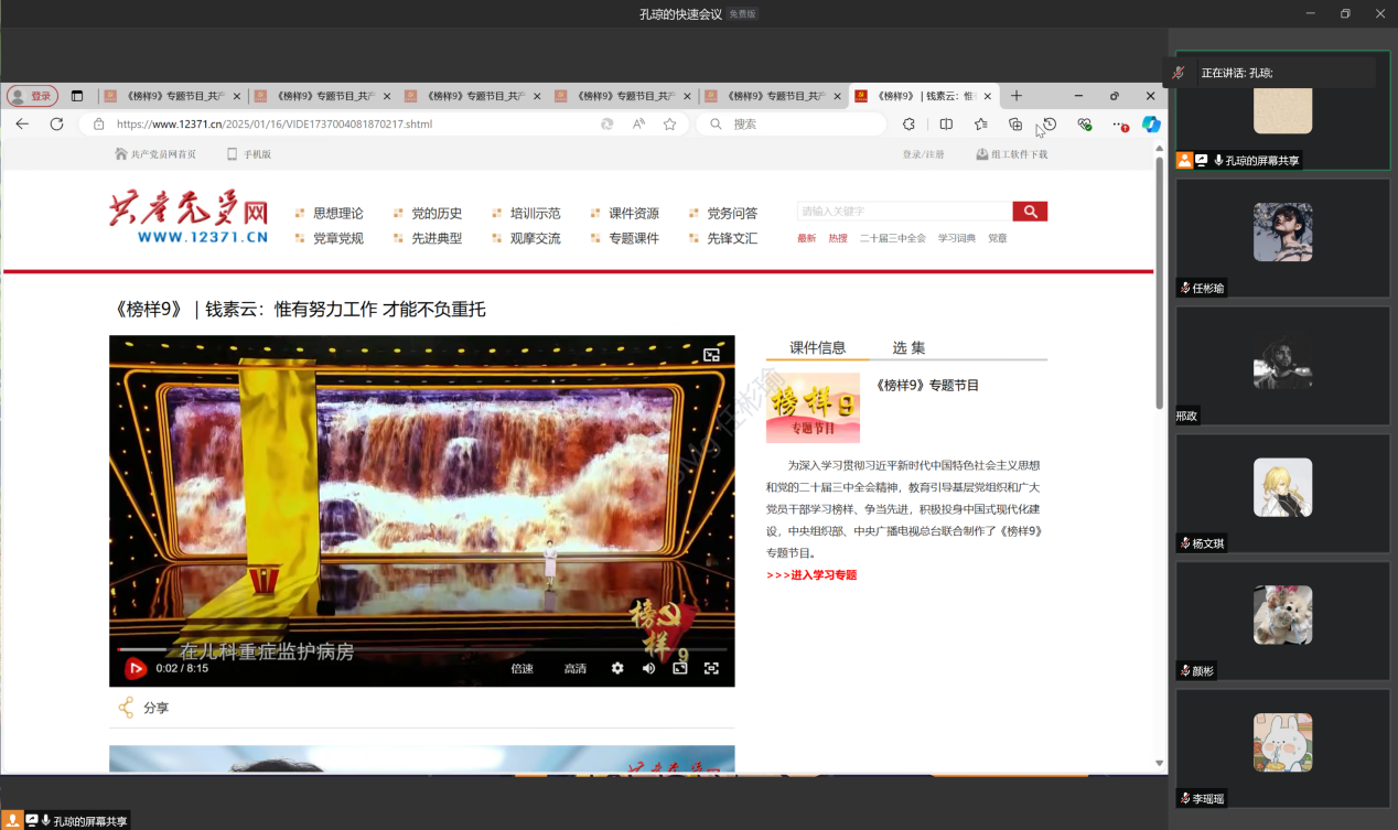 2025年1月17日,2138CC太阳集团学生第二党支部成功举办了一场以“榜样9”为专题的组织学习会。会议由孔琼同志主持,本次学习会旨在通过榜样人物的感人事迹,引导预备党员、发展对象和入党积极分子坚定理想信念、强化宗旨意识、激发担当精神,努力向党组织靠拢和争做一名合格党员。